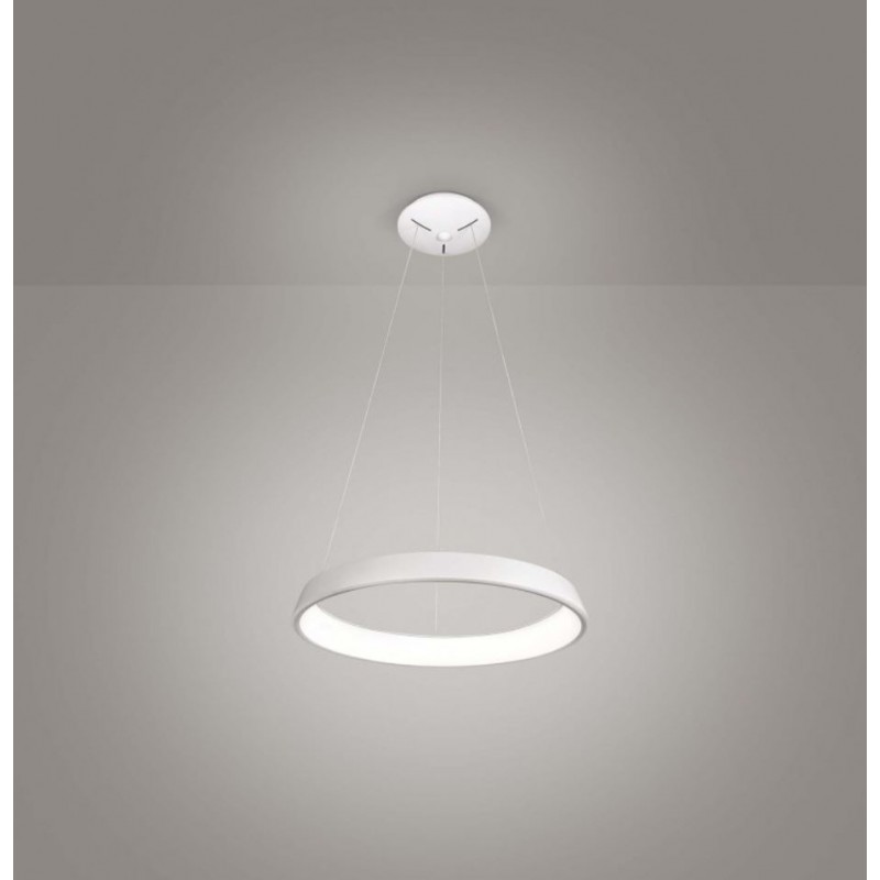 Sospensione della serie ANELLI DIODI di Affralux, composta da un elemento circolare realizzato in alluminio verniciato bianco finitura satinata e diffusore interno in PMMA.