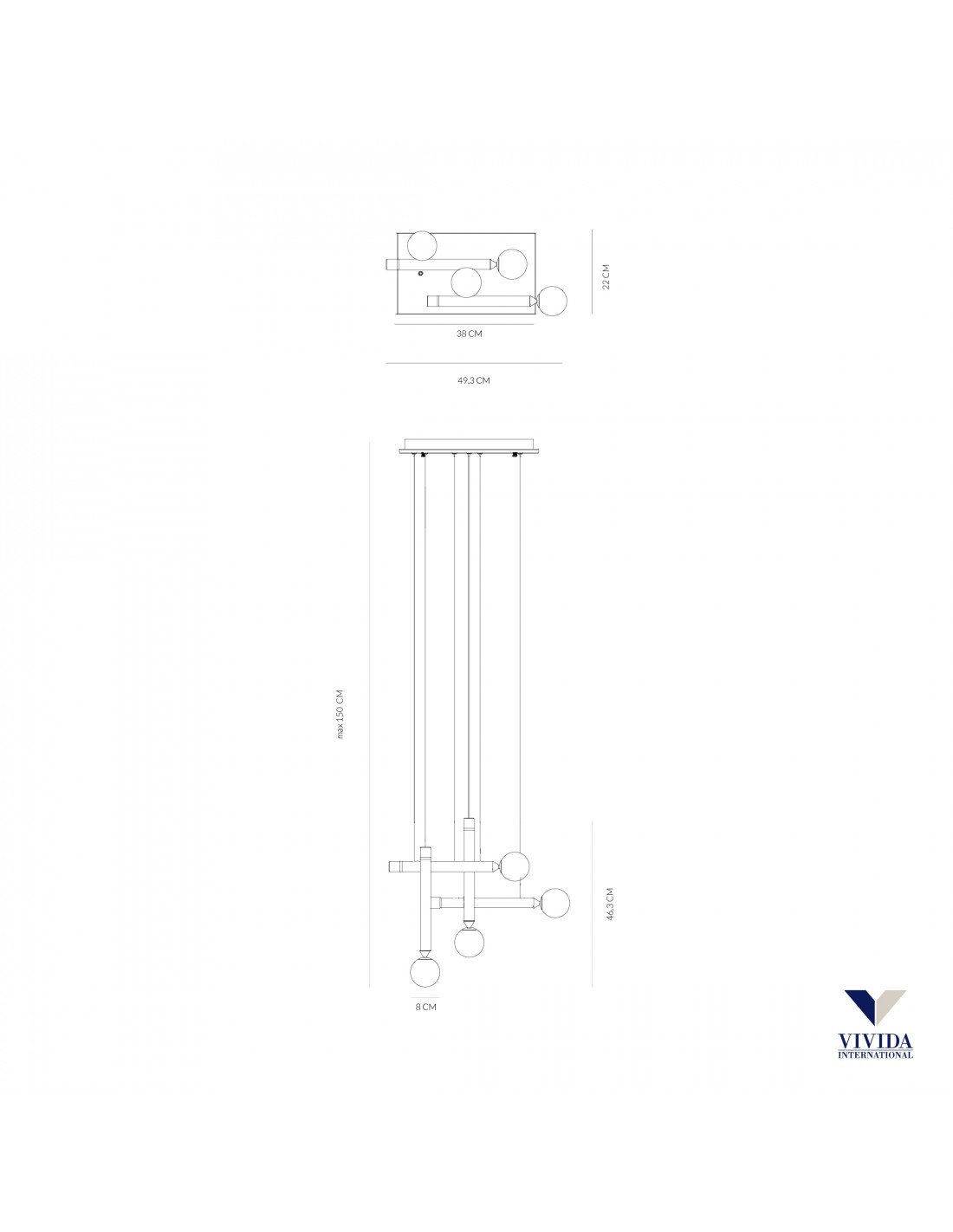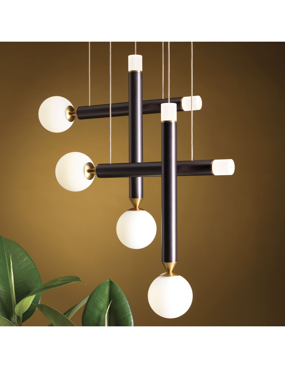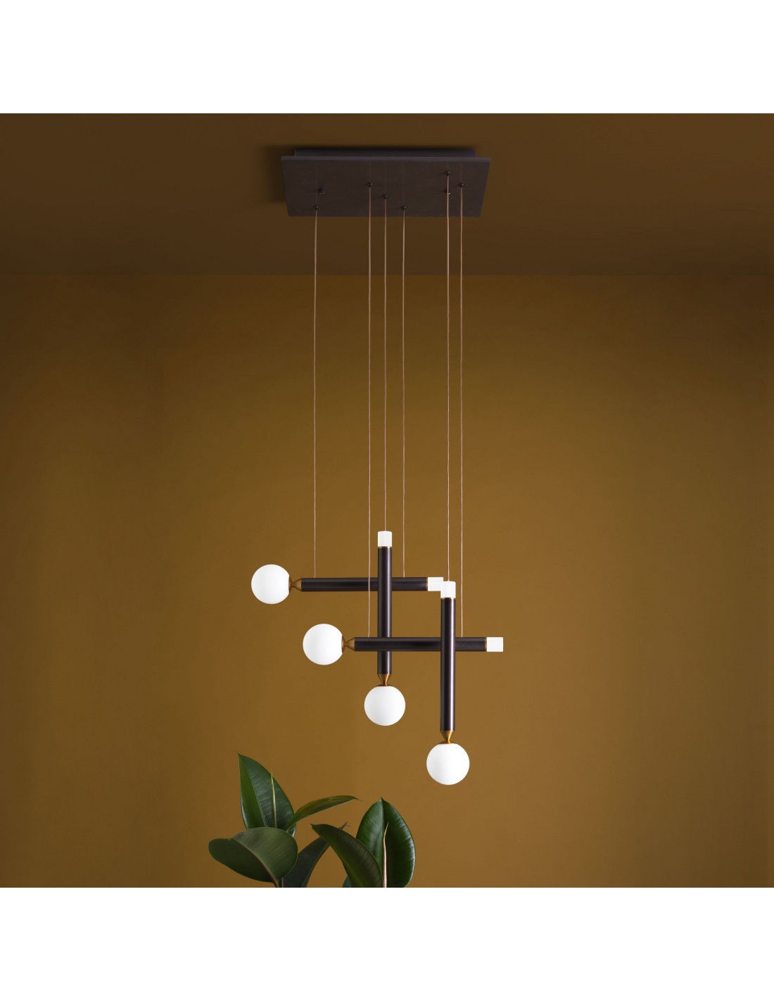 La sospensione SEVENTY 4 del marchio VIVIDA INTERNATIONAL è formata da una struttura in alluminio finitura marrone ossidato composta da rosone quadrato, cavi regolabili e 4 elementi cilindrici, 2 verticali e 2 in orizzontale. Le fonti luminose sono presenti sia nella struttura sia nelle 4 sfere in vetro bianco.