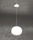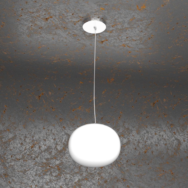 La struttura è in metallo cromato, mentre il diffusore è una sfera schiacciata in vetro soffiato e acidato bianco opaco. Altezza regolabile.