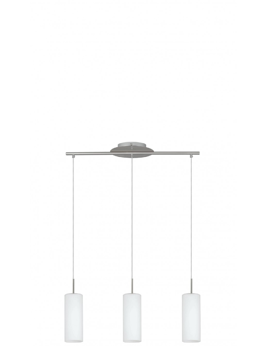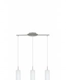 La sospensione TROY del brand EGLO presenta una struttura in metallo finitura nichel satinato e 3 diffusori a forma cilindrici in vetro satinato bianco.