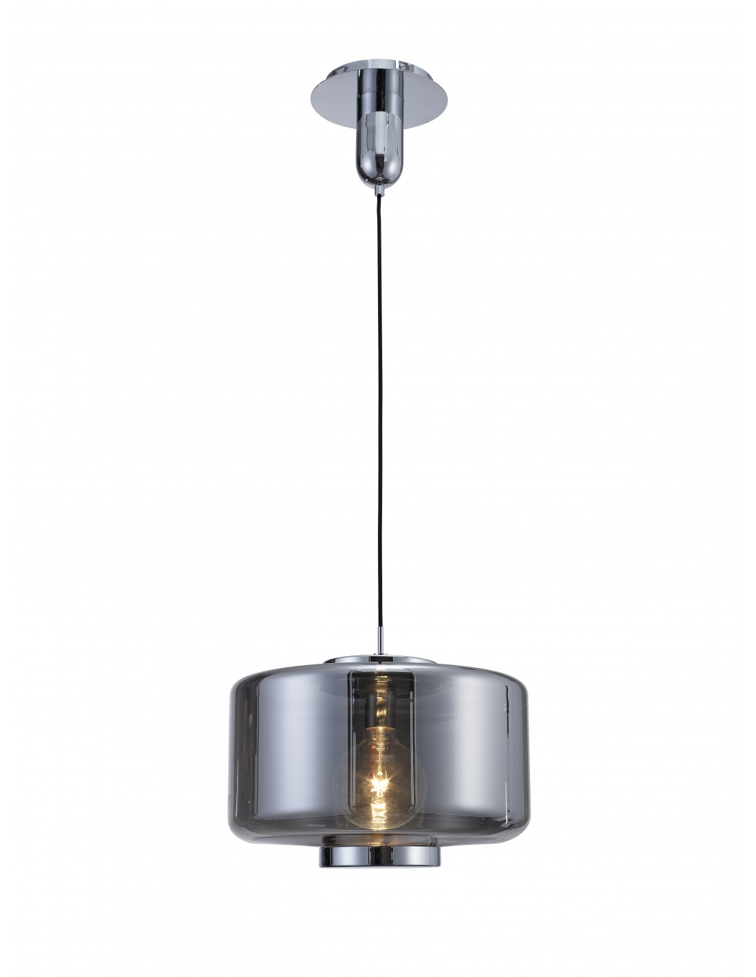• Lampada a sospensione della serie JARRAS di Mantra inlluminazione composta da rosone in metallo cromato e diffusore in vetro grafite diametro Ø40 cm. Cavo regolabile in lunghezza.